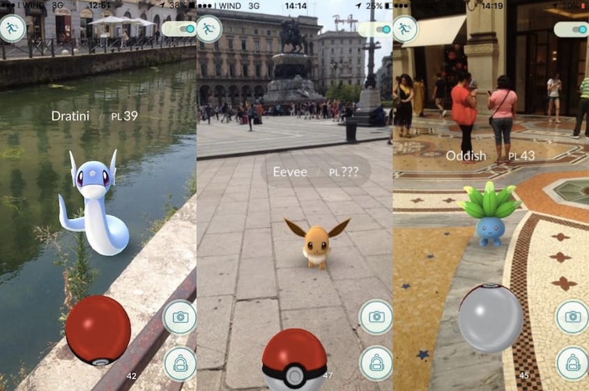 透過擴增實境的技術,玩家可以在日常生活地點發現精靈寶可夢。圖為玩家在義大利當地發現的精靈寶可夢。