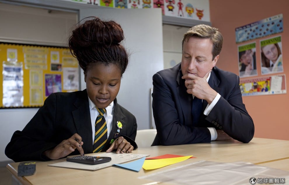 英國前首相卡麥隆看著 15歲的中學生解題。根據國際調查,上海、新加坡和香港的中學生算術能力比英國同齡學生佳。