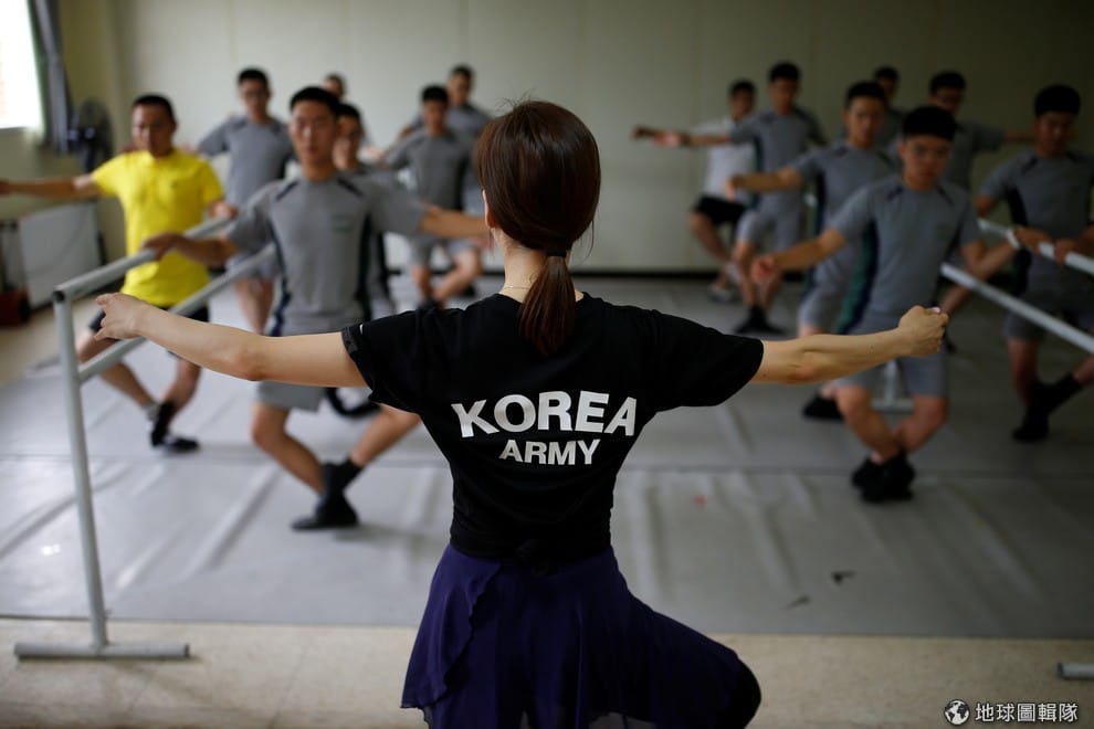 《路透社》報導指出,為了讓長年在非軍事區守衛的士兵舒緩壓力,韓國政府邀請芭蕾舞教師到該區教士兵們學芭蕾。