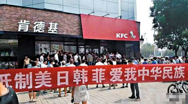 目前,中國境內有超過 4,000家肯德基,抗議民眾手持寫有「抵制美日韓菲,愛我中華民族」、「你吃的是美國的肯德基,丟的是咱老祖宗的臉」的布條,站在店門口阻擋想入內用餐的客人,還對客人大喊如果他們在肯德基消費就是叛國賊。