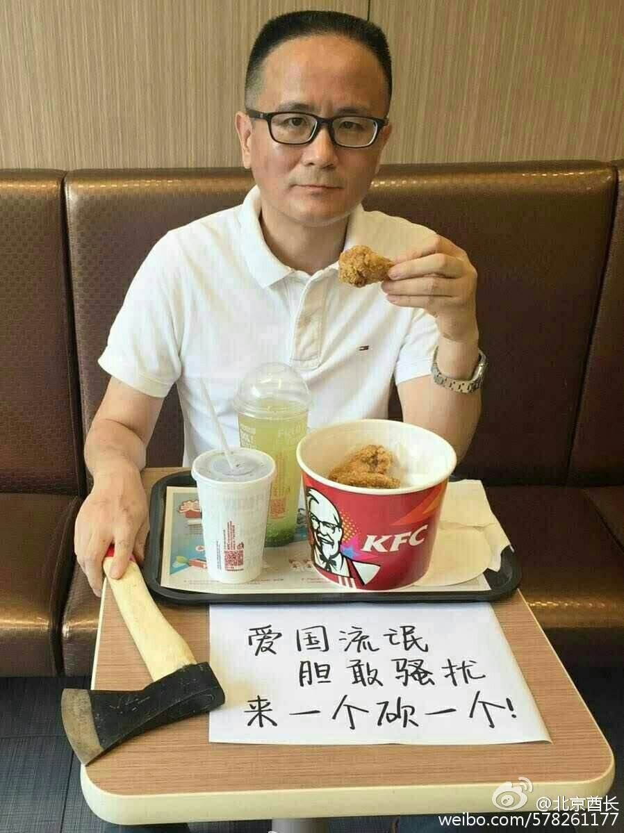 雖然有中國民眾在肯德基外抗議,有人還是照樣享受美味的炸雞。一名網友拿著寫有「愛國流氓膽敢騷擾,見一個砍一個!」字樣的海報,進入肯德基用餐。