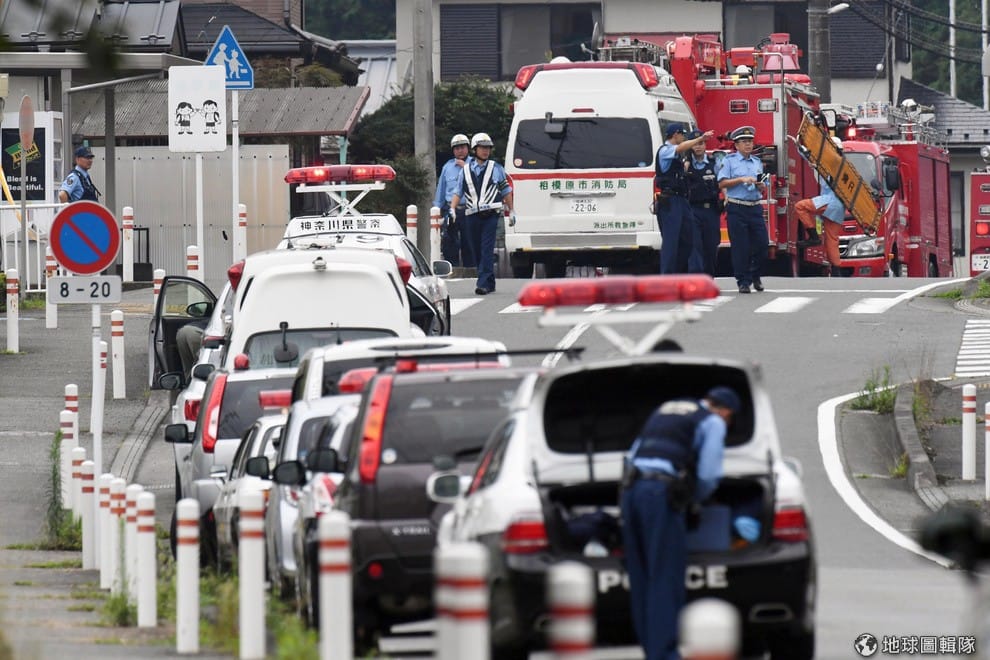 案發地點可見成排的救護車和警車待命。這起事件在重大兇案相對少的日本受到高度矚目。