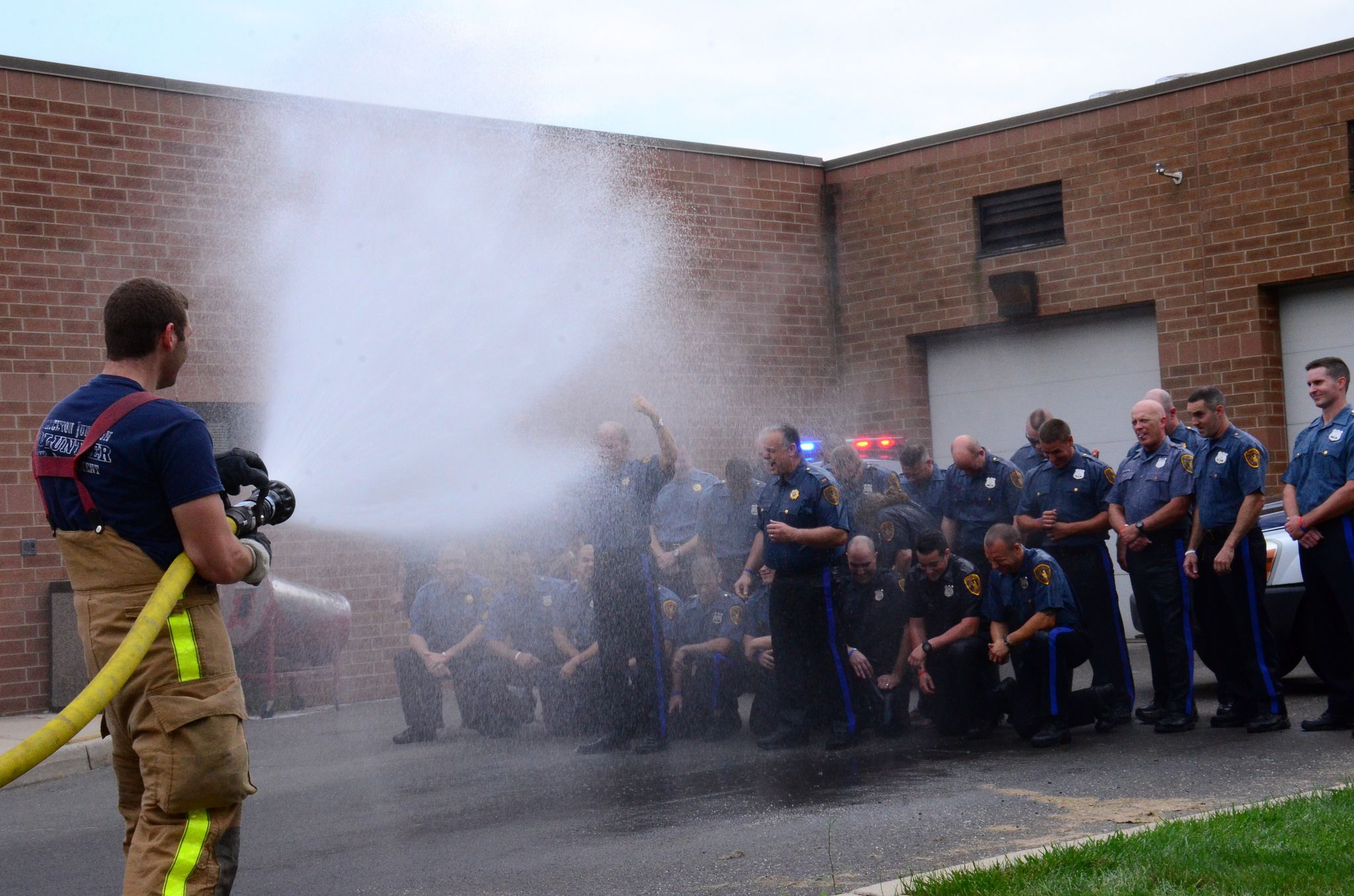 美國紐澤西州的警消參加冰桶挑戰,直接出動消防車灑水。