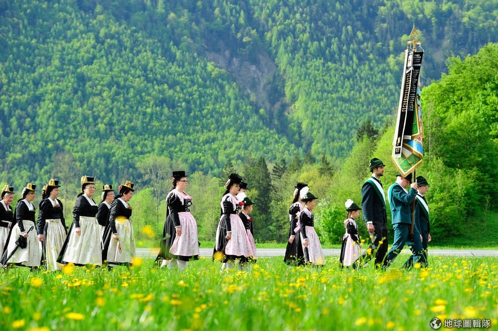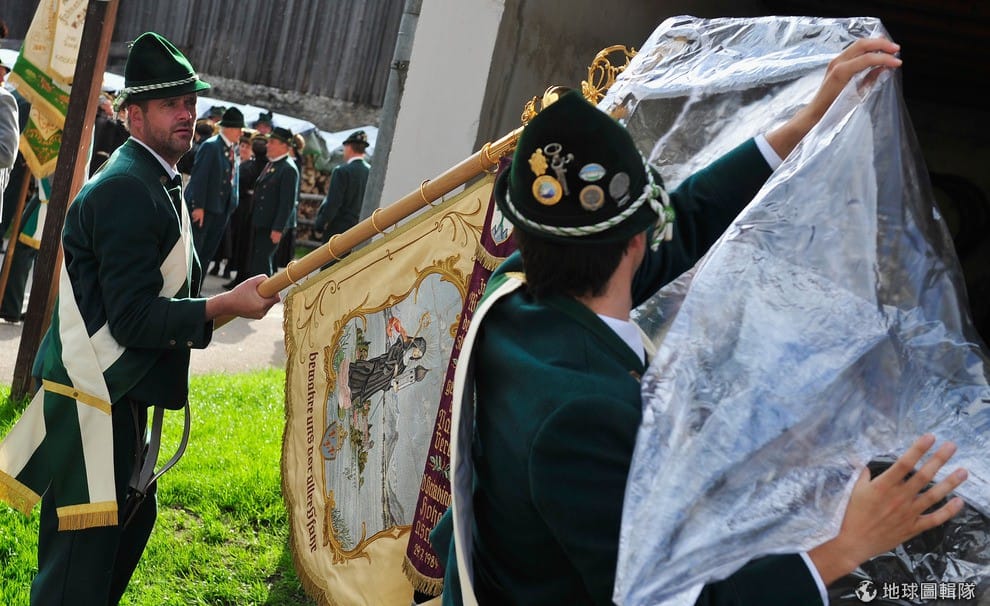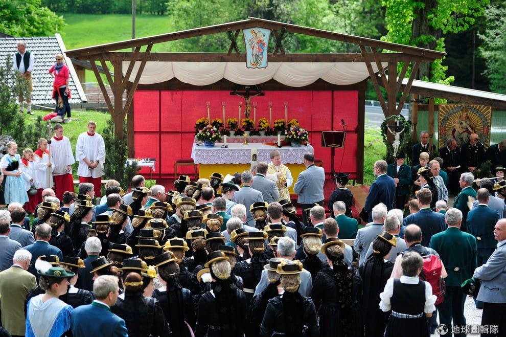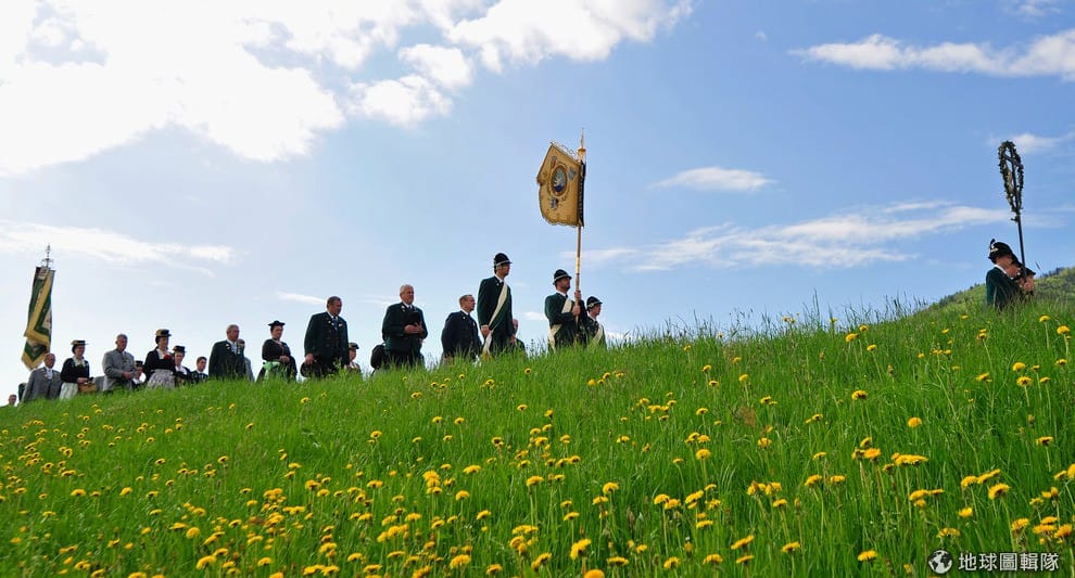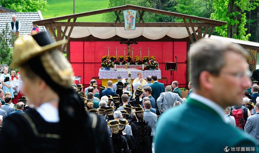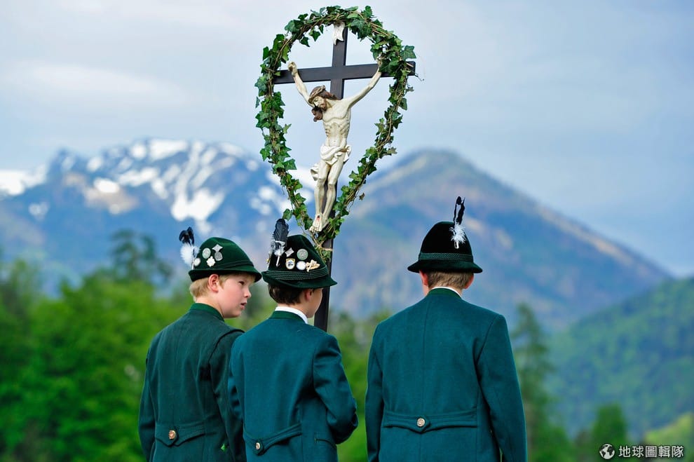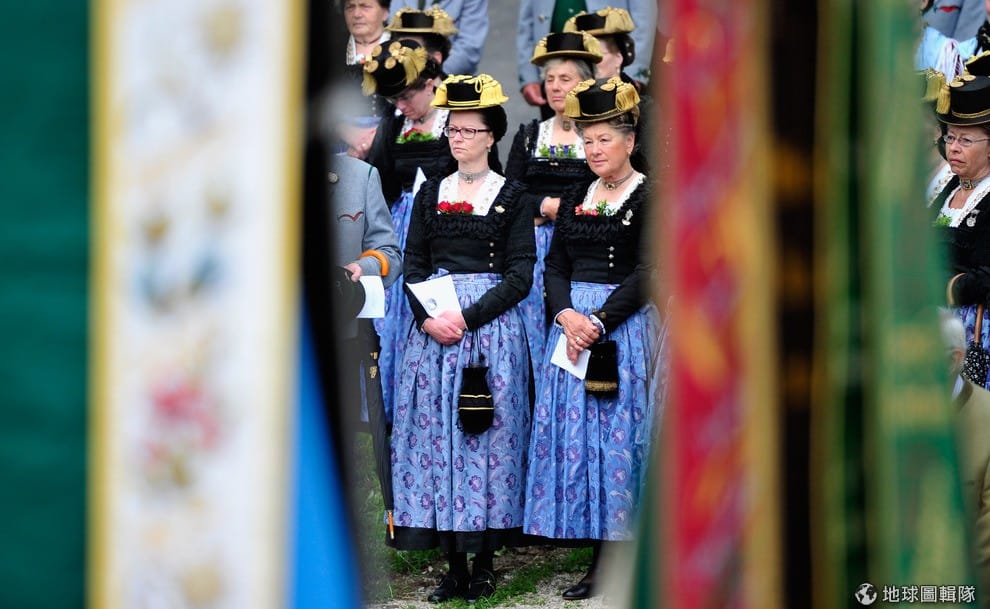 男男女女都穿上巴伐利亞傳統服飾, 一同隨著高舉的耶穌像前進。Lennart Preiss/Getty Images