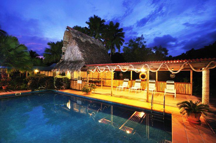 圖為渡假村內的泳池,當黑夜降臨,工作人員會點起溫暖的黃色燈光,迎接在外頭玩了一天的旅客。