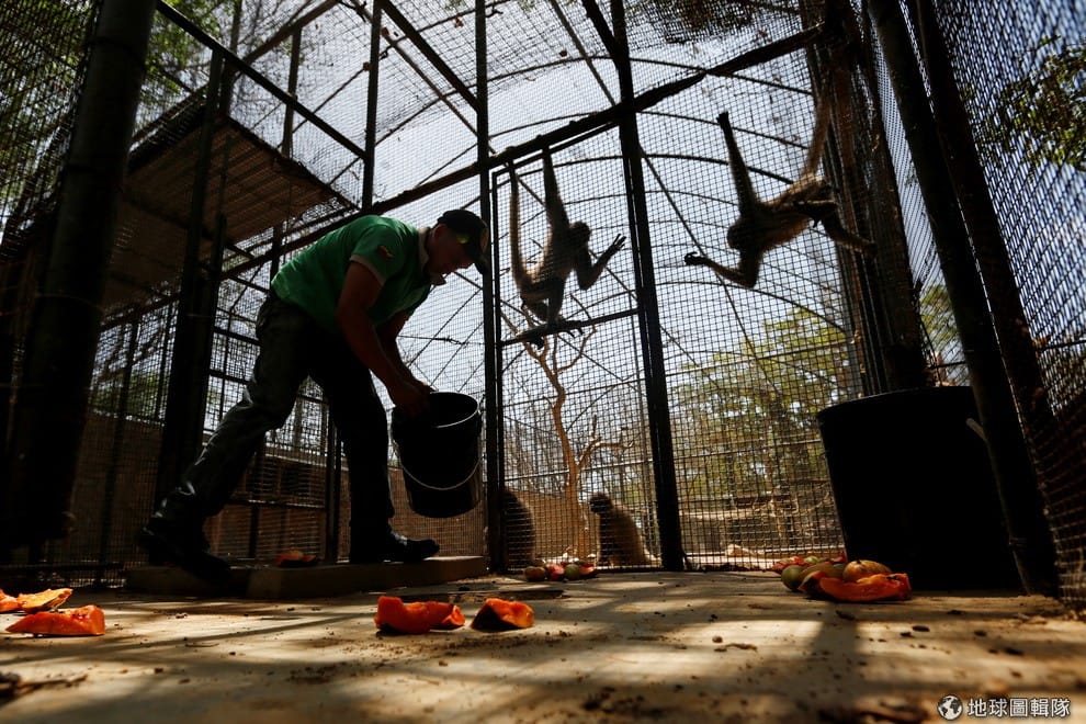 路透社工作人員準備木瓜給蜘蛛猴吃。