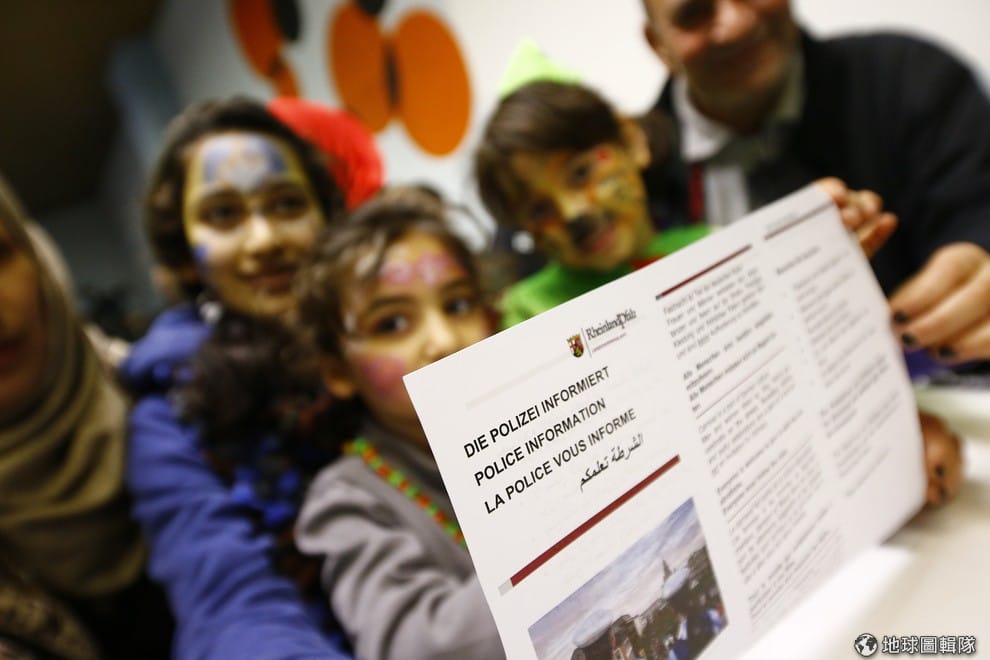 路透社難民小朋友手上拿著德國當局發放的簡介,上面介紹了當地人的社交禮儀,幫助難民融入德國社會。