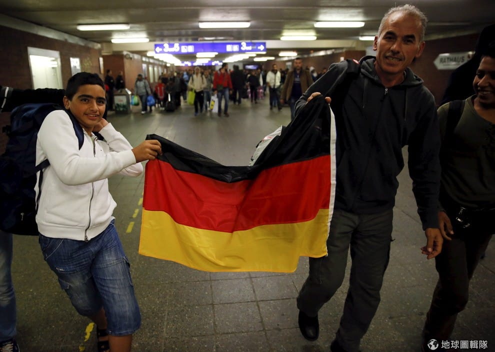 圖為搭乘火車抵達德國的難民,他們開心地拿著德國國旗入境。從去年開始,不斷有來自中東的難民湧入德國,梅克爾擔心有伊斯蘭國恐怖分子混入其中。