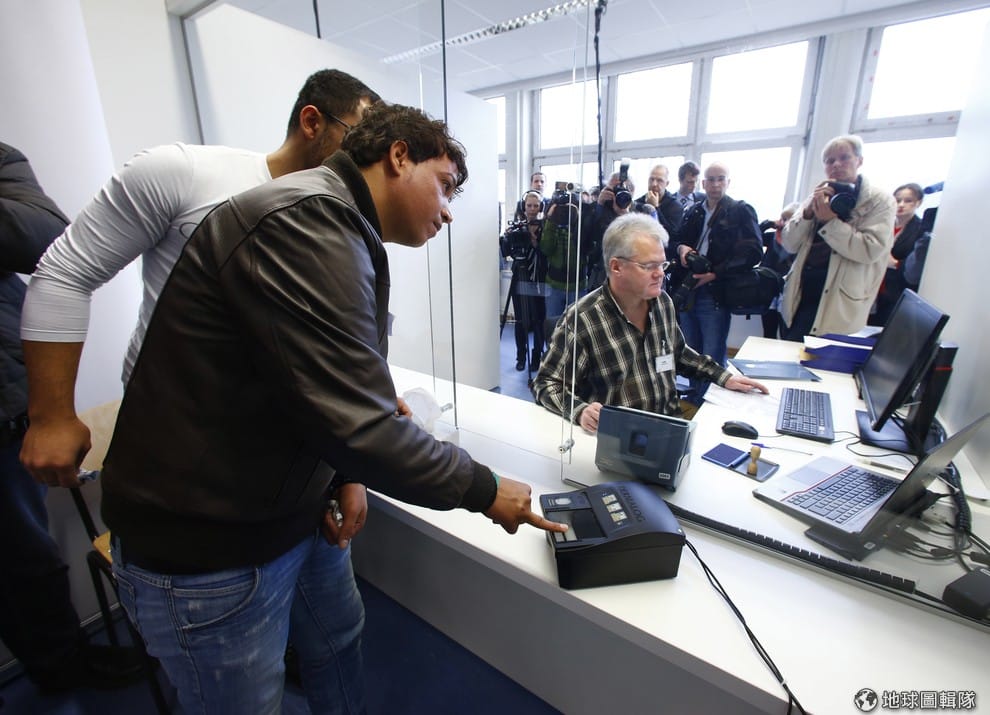 德國總理梅克爾承諾會加強維安,保護民眾的人身安全,其中包含確實做好難民登記。圖為海德堡當地的難民收容中心,承辦人員正在收集難民的指紋。
