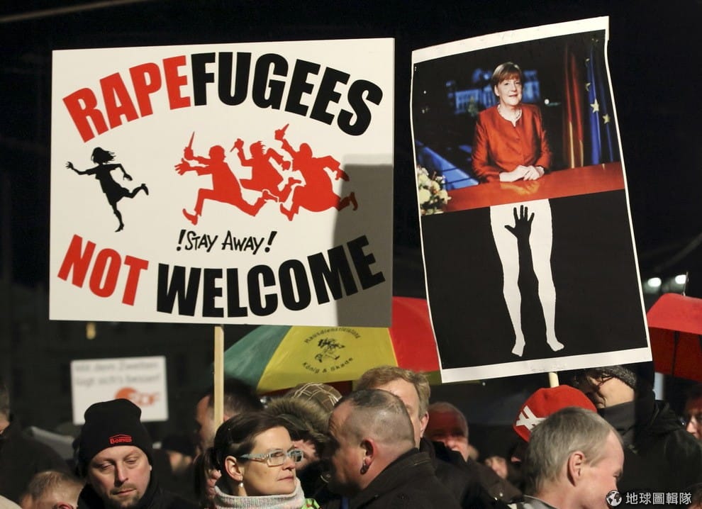 反對難民入境德國的民眾,高舉寫有「不歡迎強暴犯難民」字樣的牌子,抗議梅克爾的開放政策。