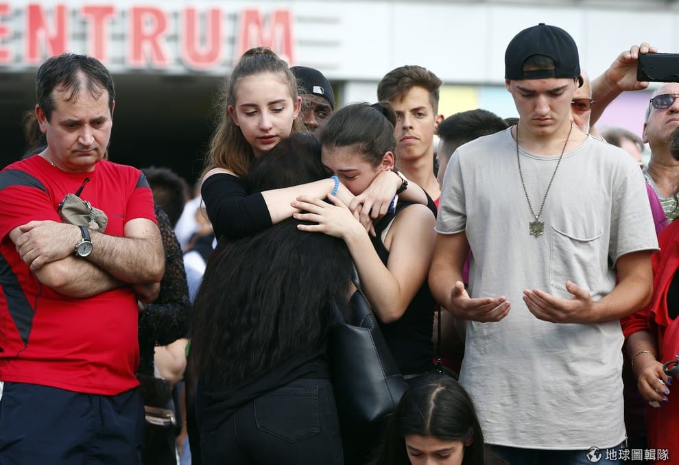 在慕尼黑奧林匹亞購物中心槍案現場,傷心的家屬抱在一起,哀悼在攻擊事件中罹難的親友。
