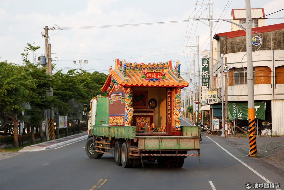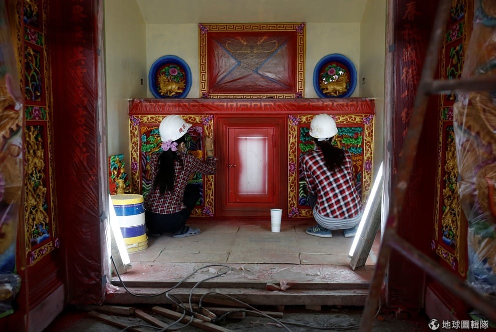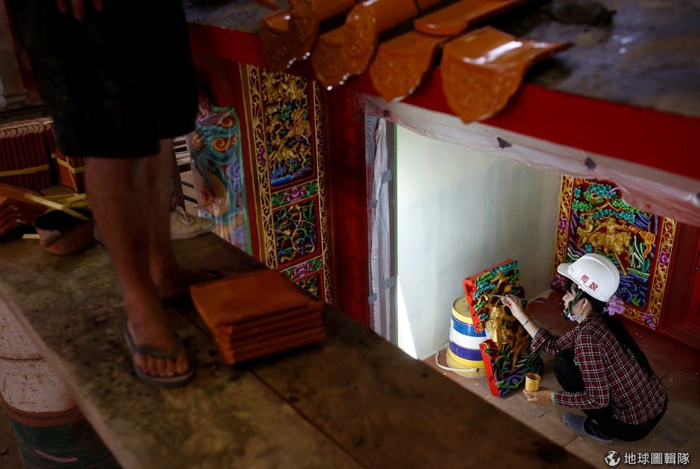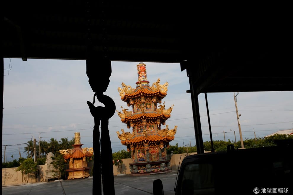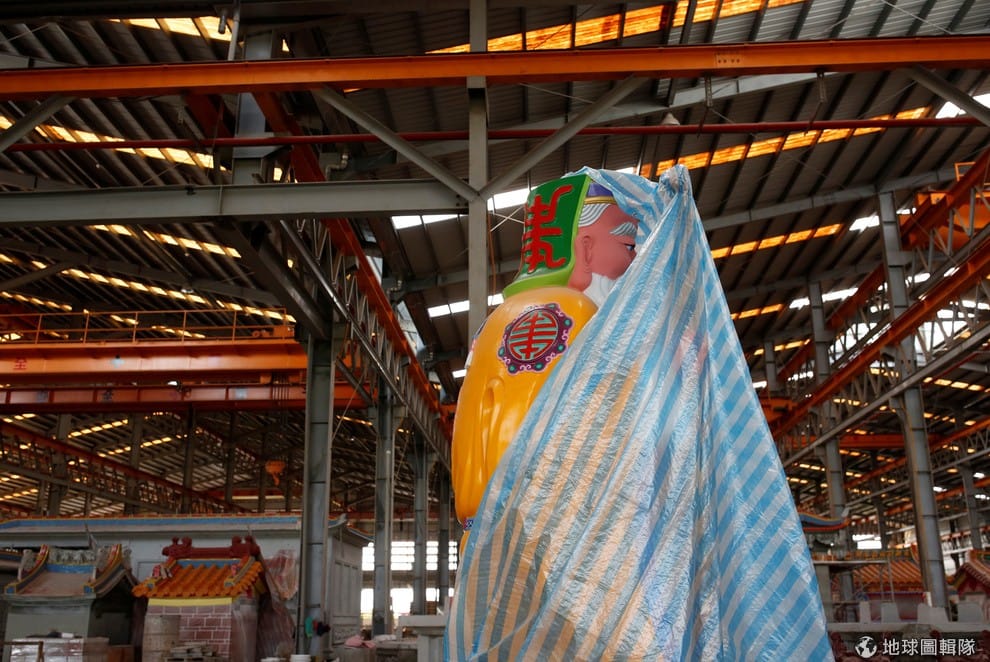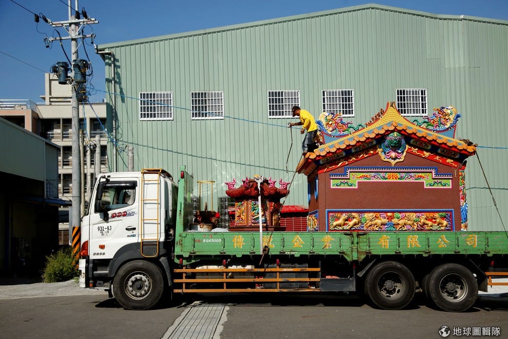 台灣屏東縣南州鄉,今年 78歲的老闆林復準戴著白色安全帽走在工廠中,他向一旁的《路透社》記者介紹自己的移動廟工廠。