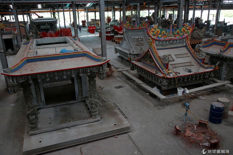 工廠內,上百名的工作人員忙碌穿梭在水泥半乾或上色到一半的廟宇旁,走上梯台往下一看,就會發現諾大的廠房聚集著數十座的小型廟宇。