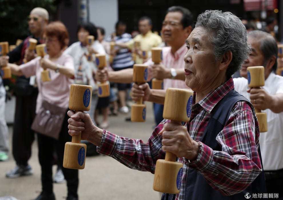 想要活得久,除了注意身體健康,還要常保心情愉快。圖為一群開心運動的日本爺爺奶奶。