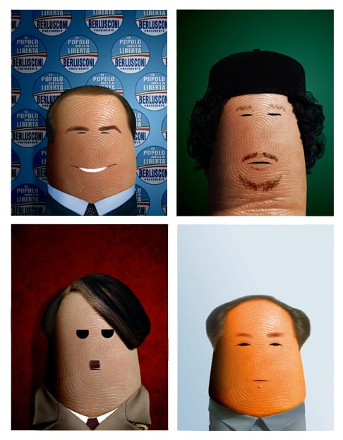 萬提斯從生活中取材,影視、藝術、政治領域無所不包,他的「手指名人團」也越來越壯大。從左上到右下分別是前任義大利總理貝魯斯柯尼(Silvio Berlusconi)、利比亞強人格達費(Muammar Gaddaf)、德國納粹領袖希特勒(Adolf Hitler)和中國共產黨創始人毛澤東。
