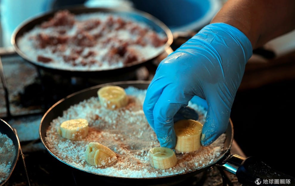 餐廳人員正忙著把材料裹上樹薯粉。