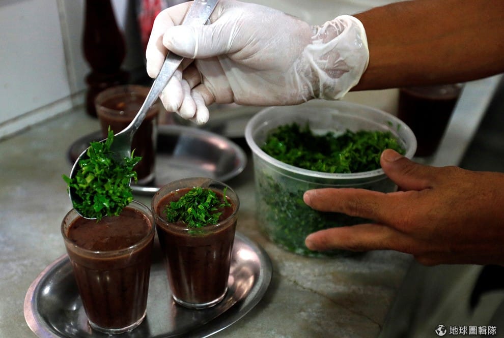廚房人員正舀出豆子湯,準備搭配傳統料理。