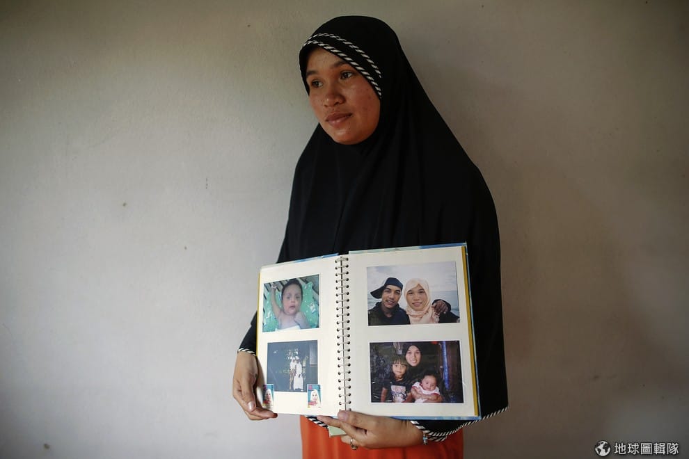 蘿絲妮(Rusnee Maeloh)手上拿著和家人的合照,她們一家住在衝突不斷的泰國南部,她的丈夫在槍戰中身亡。