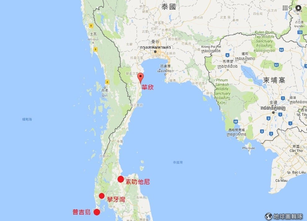 路透社圖中紅點由上往下分別為華欣、素叻他尼、攀牙灣和普吉島,這四地近日都受到炸彈的威脅。