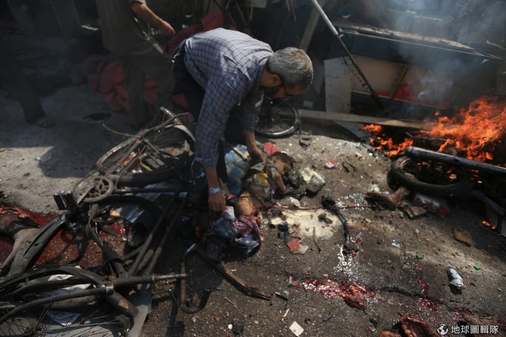 繼續閱讀一位民眾輕手輕腳地想抱起地上的孩童屍體,一旁可見空襲造成的火焰仍不斷竄出,這樣的場景已成了敘利亞民眾日常生活的一部分。