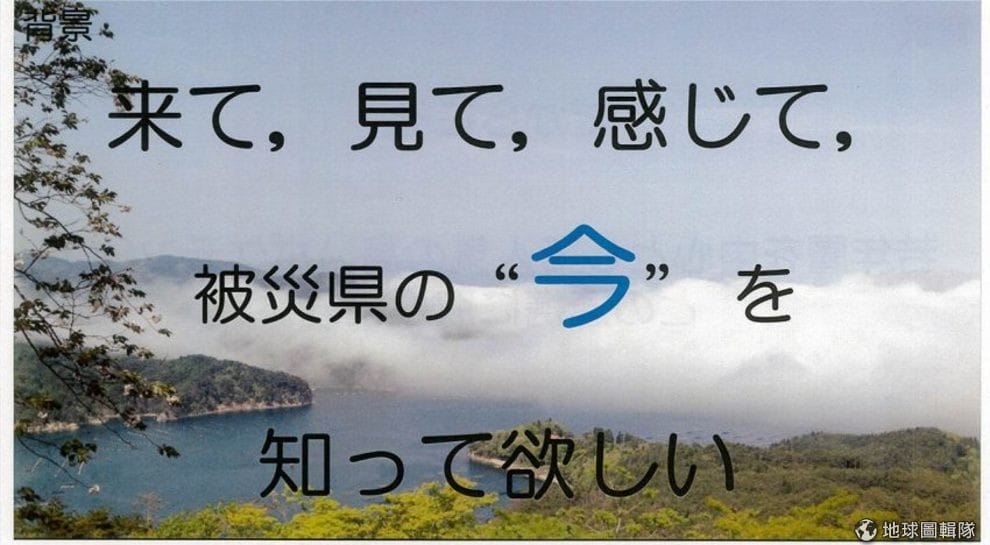 圖中的標語寫著「來吧!看吧!感受吧! 想知道受災縣的現況與當下」。也可說是整個計畫的核心概念。