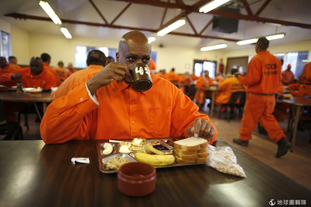 一名身穿橘色制服的受刑人正在吃早餐。隨著監獄預算刪減,受刑人的餐點品質與份量都下降,吃不飽的他們只好轉向吃泡麵。