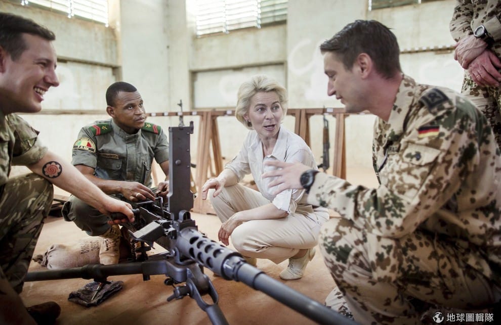 德國國防部長馮德萊恩(Ursula von der Leyen)到營區觀看德國軍人演習。2011年,德國廢除了徵兵制,但有關徵兵的條款仍然留在憲法中,要恢復徵兵制不難。