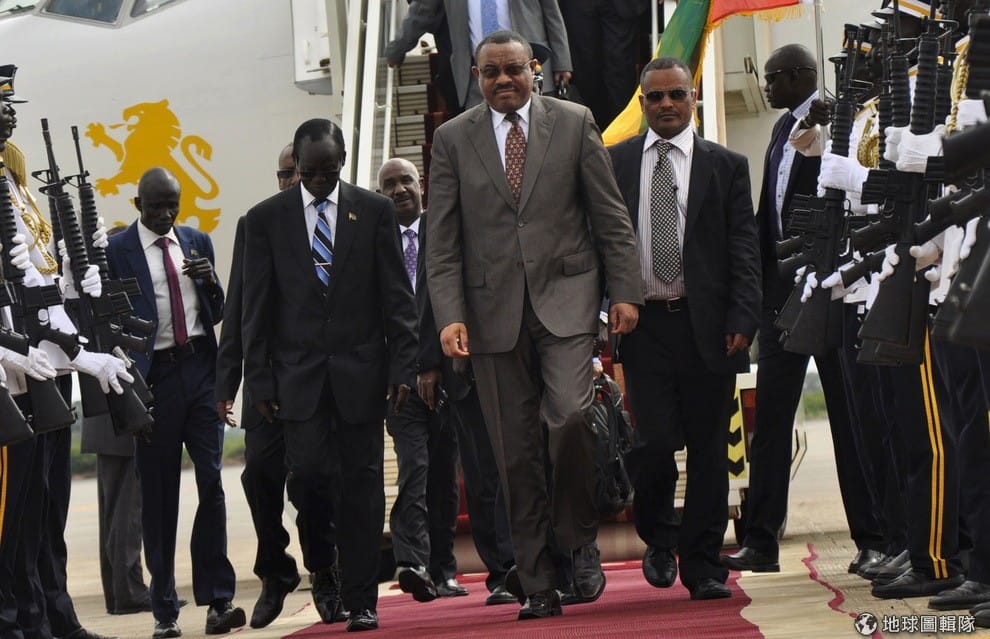 有些人相信當局是藉著消除奧羅莫族的生存空間來確保自己在衣索比亞的長期支配權。圖為衣索比亞現任總理戴沙略(Hailemariam Desalegn)前往南蘇丹簽署和平協議的情況。