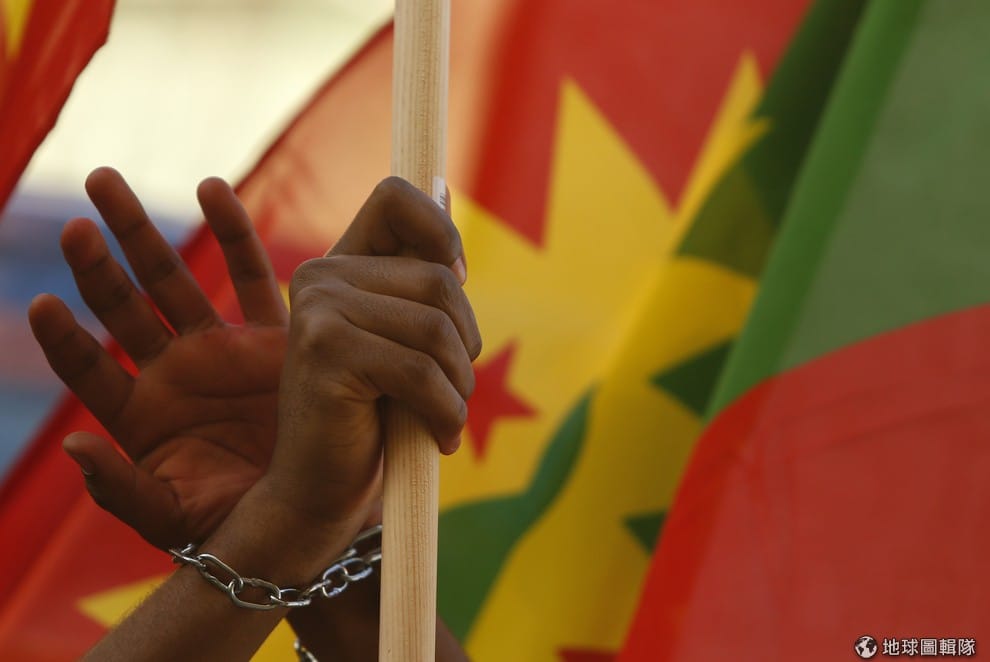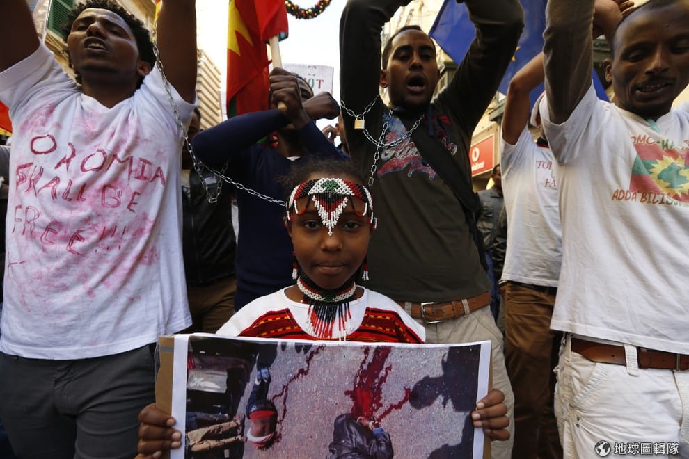 圖為 2015年12月奧羅莫族上街抗議衣索比亞政府濫殺的情況。雙手交叉的姿勢在他們長達 9個月的抗爭中已經成為一種象徵。