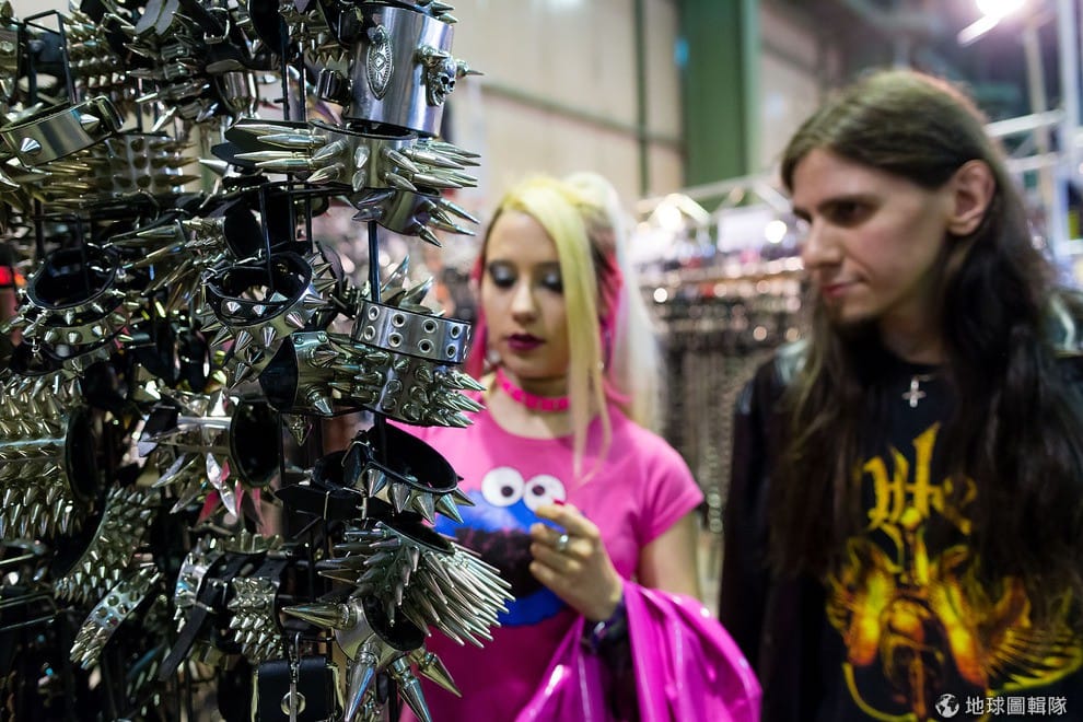 路透社回顧過去的哥德大會,在活動開始前相關的商店就會出現購物人潮。照片中是萊比錫當地專賣各種重金屬配件的店內,情侶正在挑選配件。Marco Prosch/Getty Images