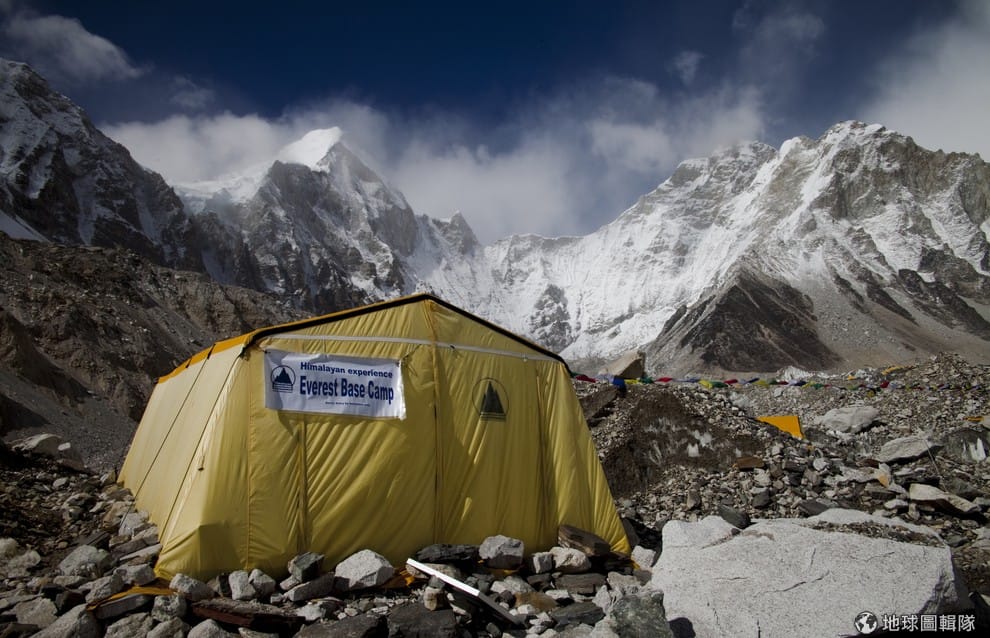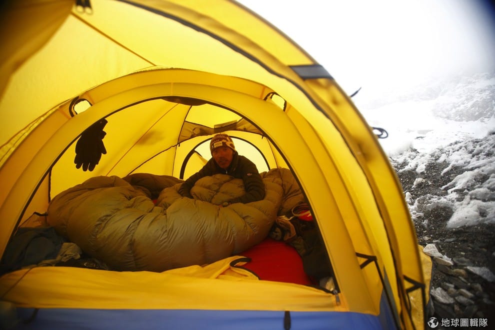 一名雪巴嚮導坐在帳篷裡面做準備。雪巴人是居住在喜馬拉雅山的民族,一出生就很適應山上稀薄的空氣,所以常被國外登山客請來當登上聖母峰的嚮導。