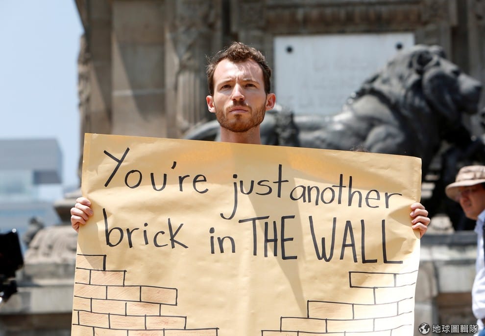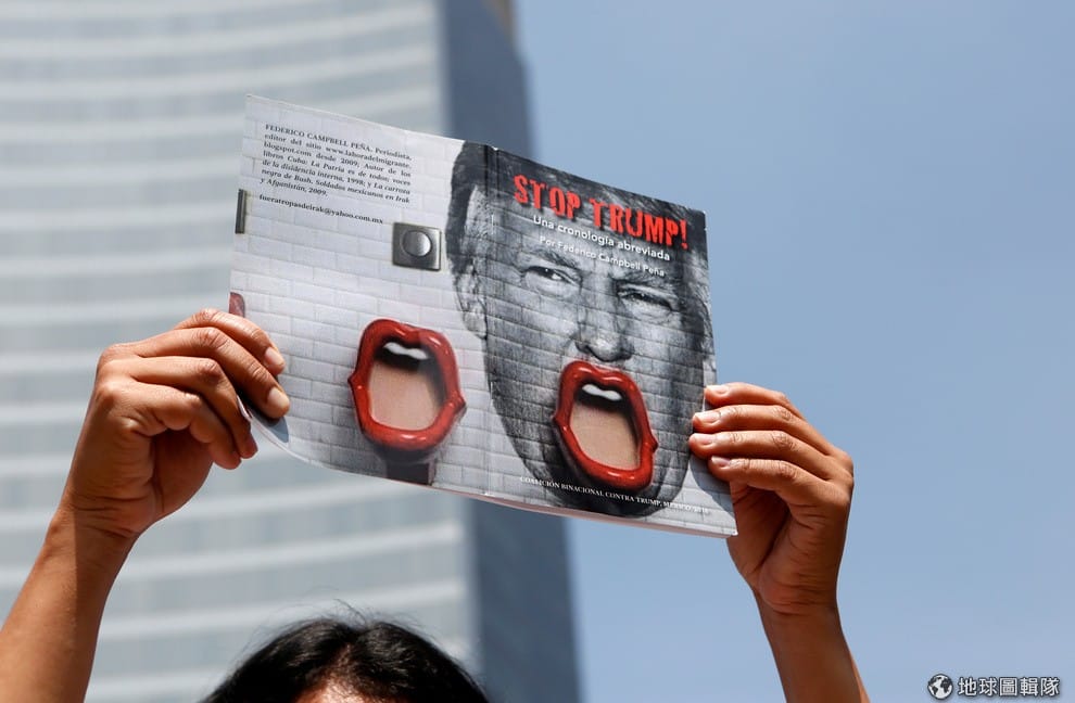 抗議川普來訪的墨西哥人,在首都墨西哥市舉起海報,上面寫著「你是圍牆的另一塊磚」。