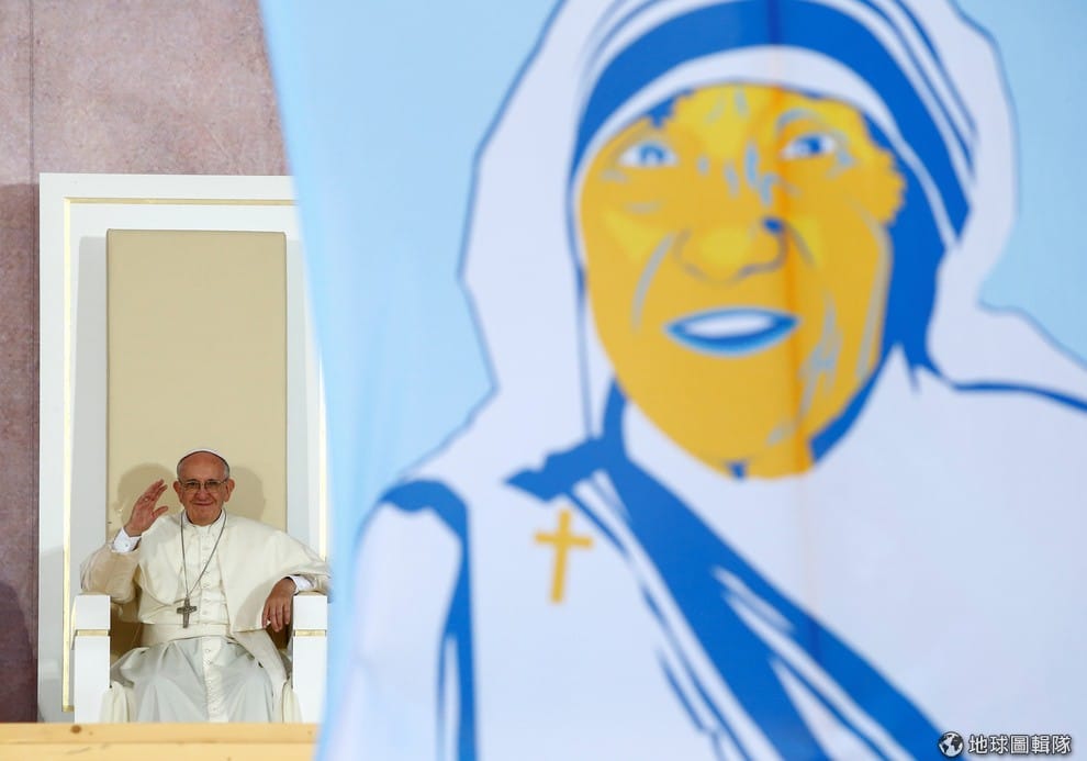 教宗方濟各在德蕾莎修女的圖像後向大眾致意。今年三月,教宗方濟各宣布德蕾莎修女的第二項神蹟獲得認證,德蕾莎修女可以封聖。