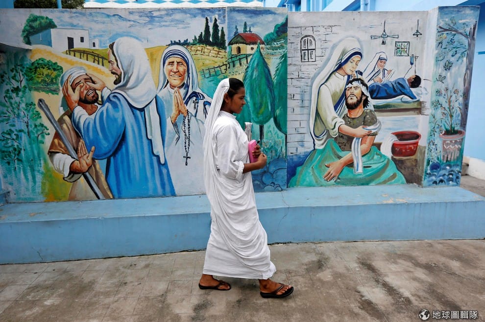 一名修女走過由德蕾莎修女在 1950年創辦的博濟會(Missionaries of Charity)。博濟會修女們的制服是白棉粗布鑲藍邊的改良式沙麗,這種質料的衣服是印度社會底層人所穿,德蕾莎修女認為既然要為窮人服務,就得穿著和他們相同的衣服。