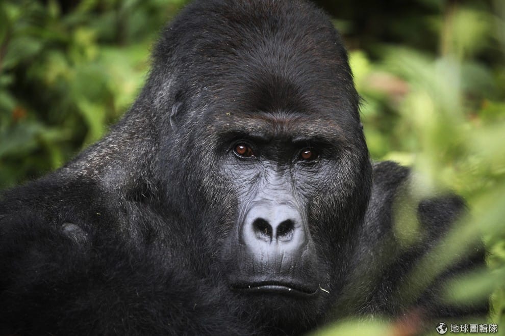 一隻東部大猩猩看向鏡頭。東部大猩猩喜歡生活在密林當中,然而隨著人類伐木和盜獵越來越盛,東部大猩猩被列入了極危名單中,急需人類的保育。