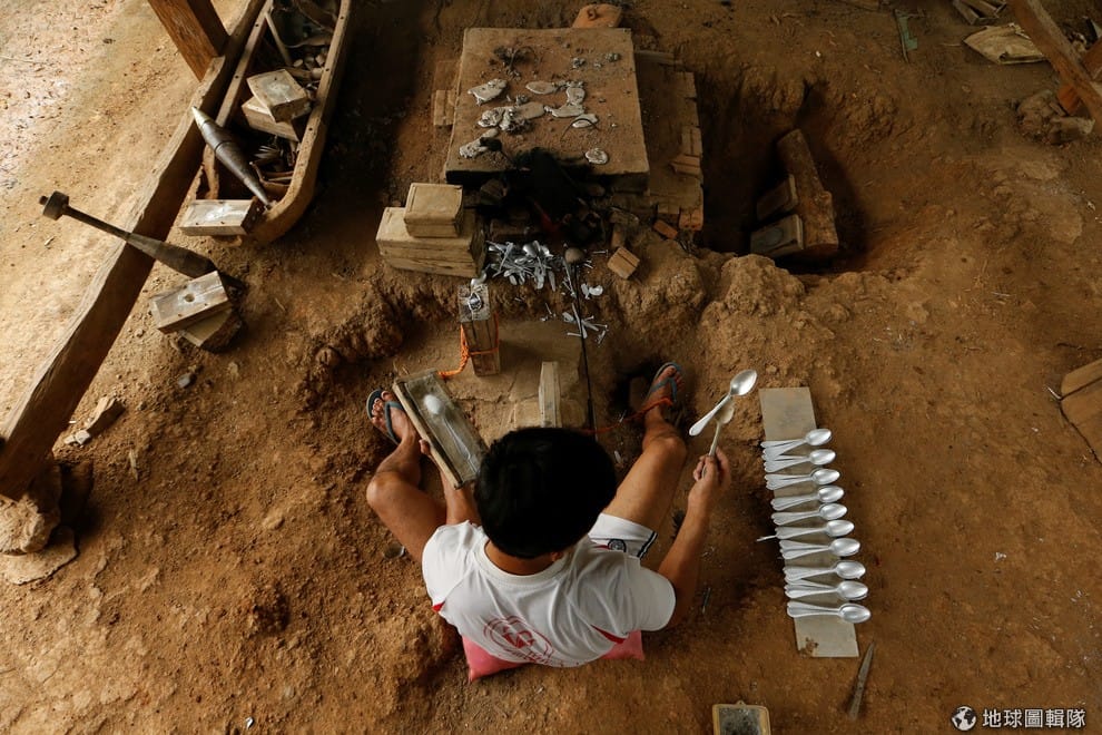 一名男子正在把炸彈的金屬碎片溶成湯匙。