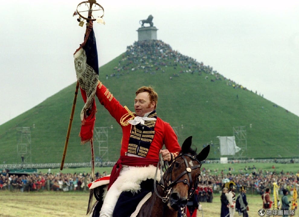 圖為重現滑鐵盧之役的演員,他們在比利時獅子丘紀念碑前上演英國威靈頓公爵擊敗拿破崙。從未在戰場上輸給法國人的英國威靈頓公爵,也在維也納會議上靠著幽默將了法國人一軍。