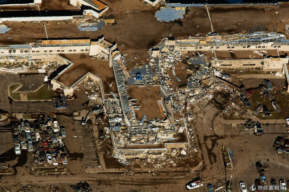 CNN、BBC、《路透社》等媒體21號報導,美國奧克拉荷馬州受到巨型龍捲風侵襲,當地一處約5萬人居住的小鎮摩爾(Moore)受到重創,樓房倒塌、校舍吹毀,強風還引起火勢竄出,鎮上一片狼藉。躲避不及的民眾和孩童被壓在碎石磚瓦下,目前已知有24人不幸喪生,約60位傷患送往當地醫院救治中。照片中是當地被毀的醫療中心。Brett Deering/Getty Images