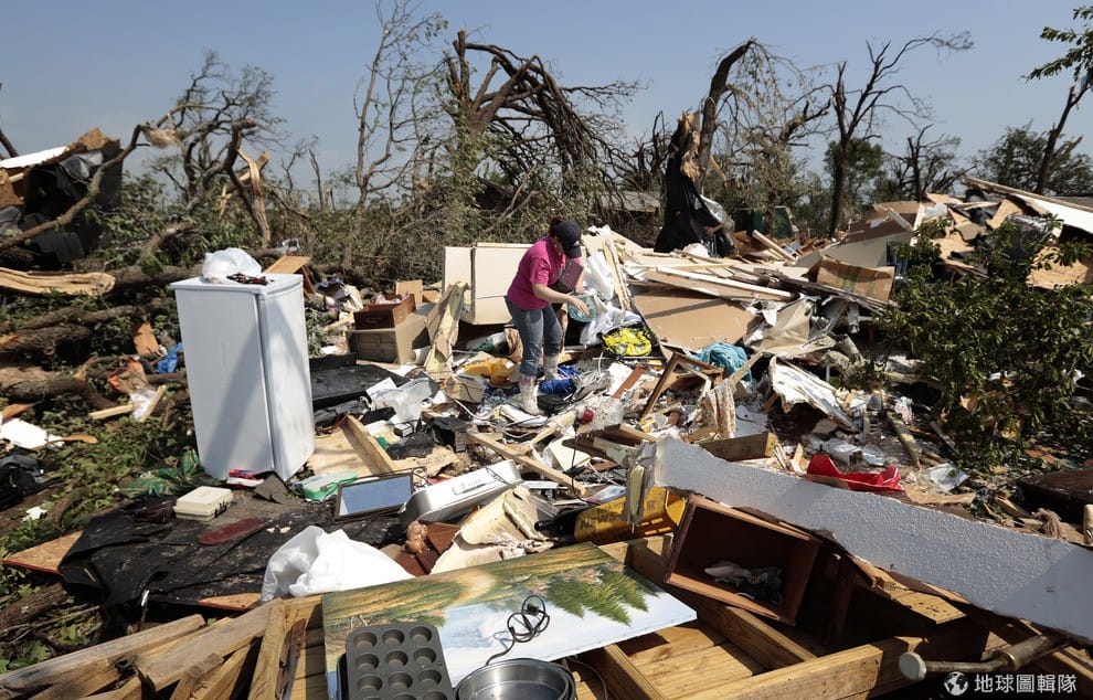 受到重創的塔樓廣場小學(Plaza Towers Elementary School),校舍的屋頂完全被吹毀,整座學校只剩下殘餘的建物骨架,有民眾在龍捲風襲擊後趕緊進入救援,將被壓在磚瓦下的學童緊急拉出救治。CNN21號報導中更新提到,有7名孩童不幸喪生,其中幾位孩童是受困在地下室中溺斃身亡。照片中是當地正在互相幫忙、清理家園的居民。Brett Deering/Getty Images
