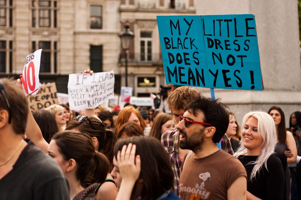 在 2011年倫敦的「蕩婦遊行」(Slutwalk meeting),一名遊行者手拿著「我穿著黑色小裙子並不代表『可以』!」的牌子。