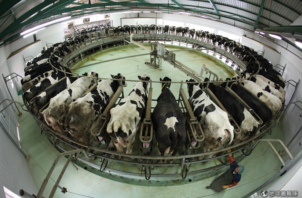 路透社照片為可以快速幫乳牛擠奶的「圓盤榨乳機」,這種高度機械化的方式也替勞工省了不少力。