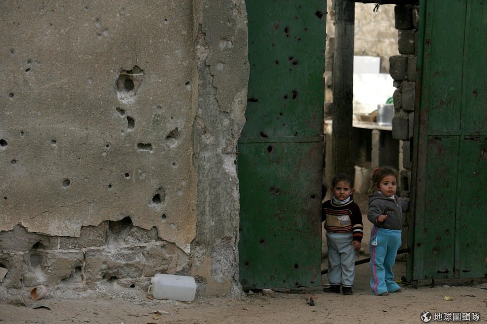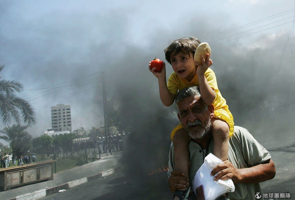 一般來說,講到加薩走廊的時候,外界大多聯想到戰爭的殘酷畫面。照片中的祖孫正在躲避從頭頂飛過的炸彈。Abid Katib/Getty Images