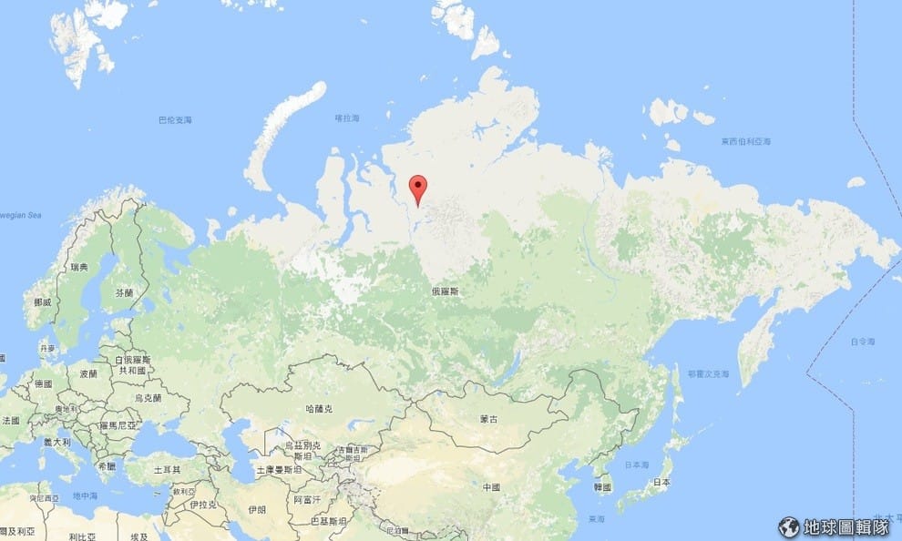 圖中紅色地標處即位於泰梅爾半島的諾里爾斯克市,也是發現血色河流的地方,該地進出不易,受到諾里爾斯克鎳業的掌控。