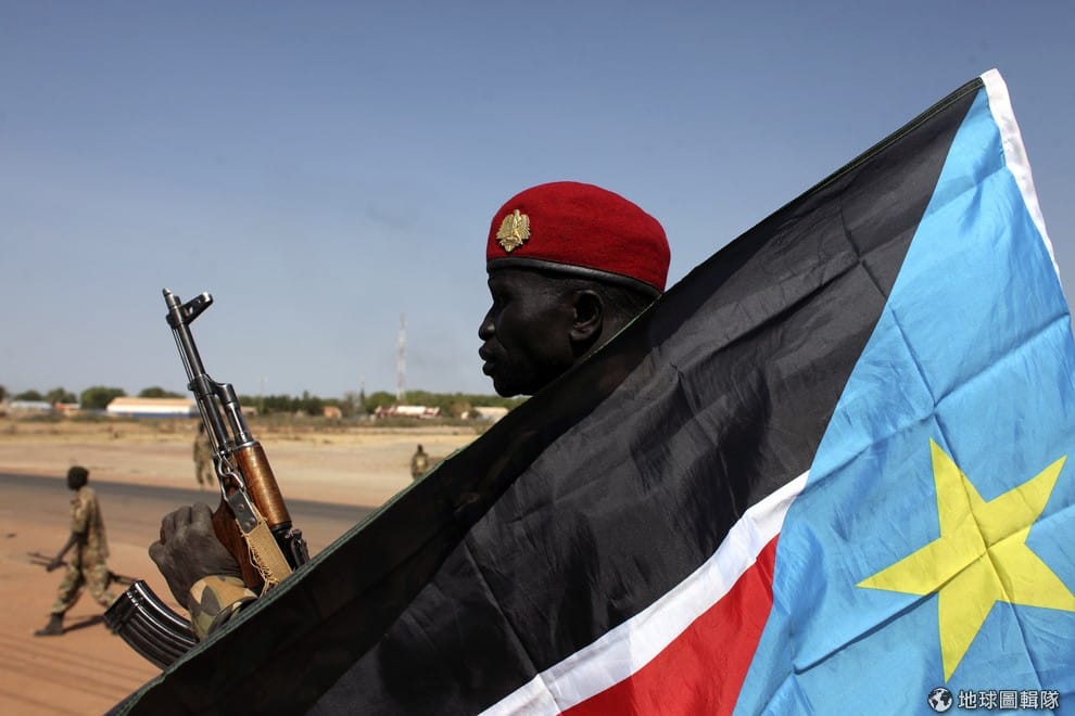 路透社一名隸屬反對派的蘇丹人民解放軍(SPLA),被南蘇丹的國旗籠罩著。