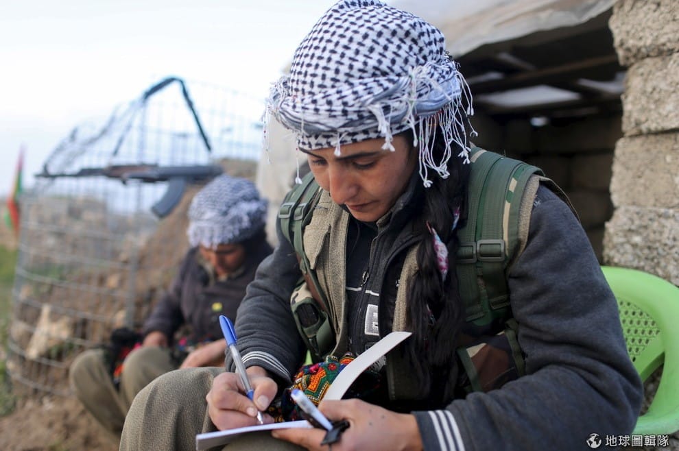 一名庫德族女戰士專心寫筆記。目前,YPJ女軍共有一萬人,2015年加入的安塔爾不過是眾女兵中的一員,但因為神似好萊塢影星獲得大眾關注。
