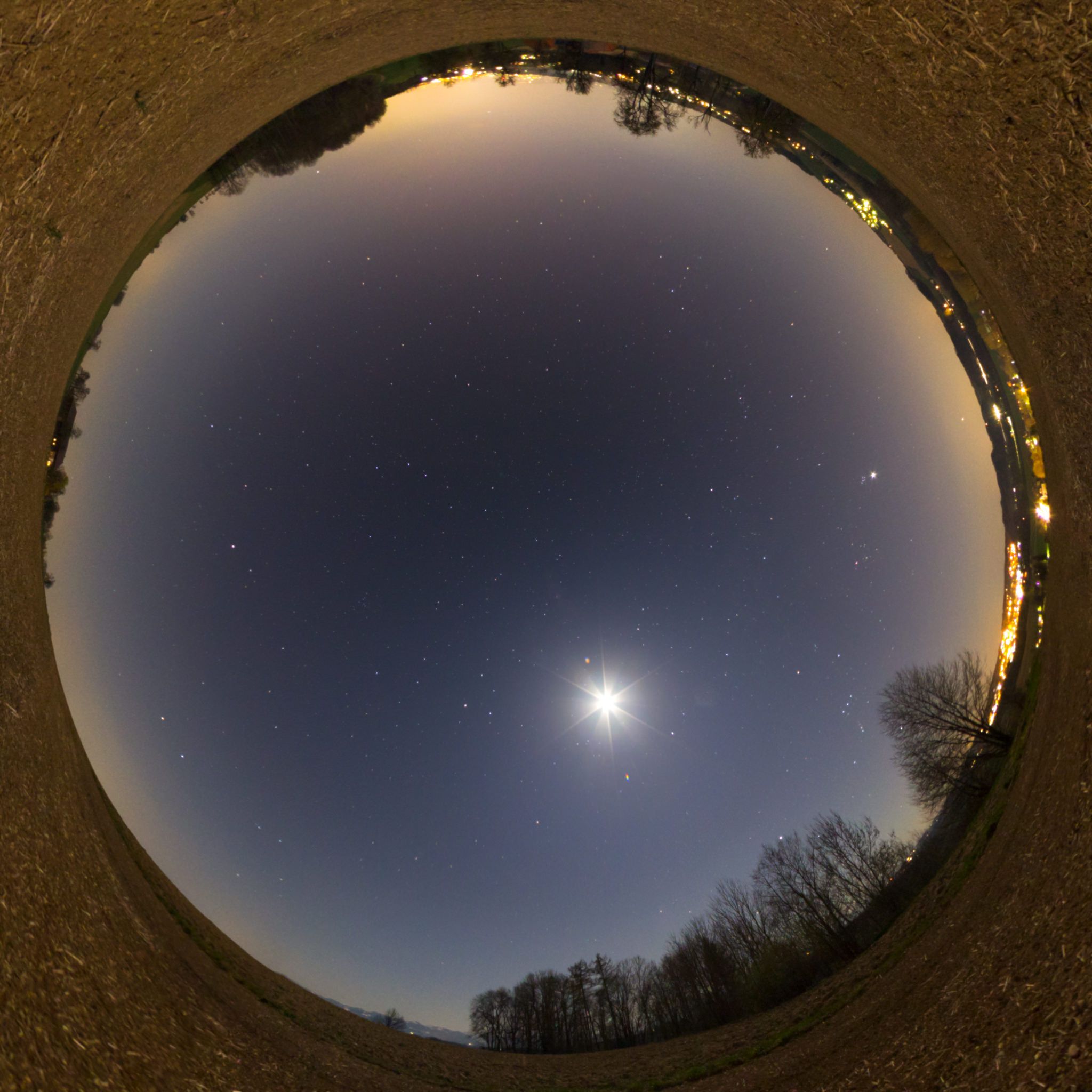 照片中攝影師用單眼相機和魚眼鏡頭將月亮與五顆行星捕捉下來,從左到右分別是土星、火星、月亮、金星、木星,還有地球本身。