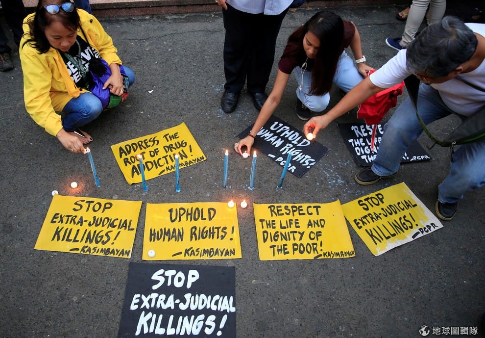 人權捍衛者在教堂前點起蠟燭、擺起抗議牌子。不滿杜特蒂縱容法外處決的行為。從左到右的牌子上寫著:「停止法外殺戮!」、「支持人權」、「尊重生命及窮人的尊嚴」。