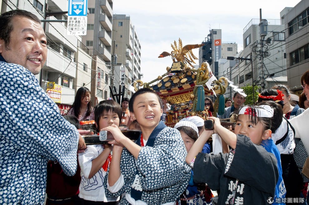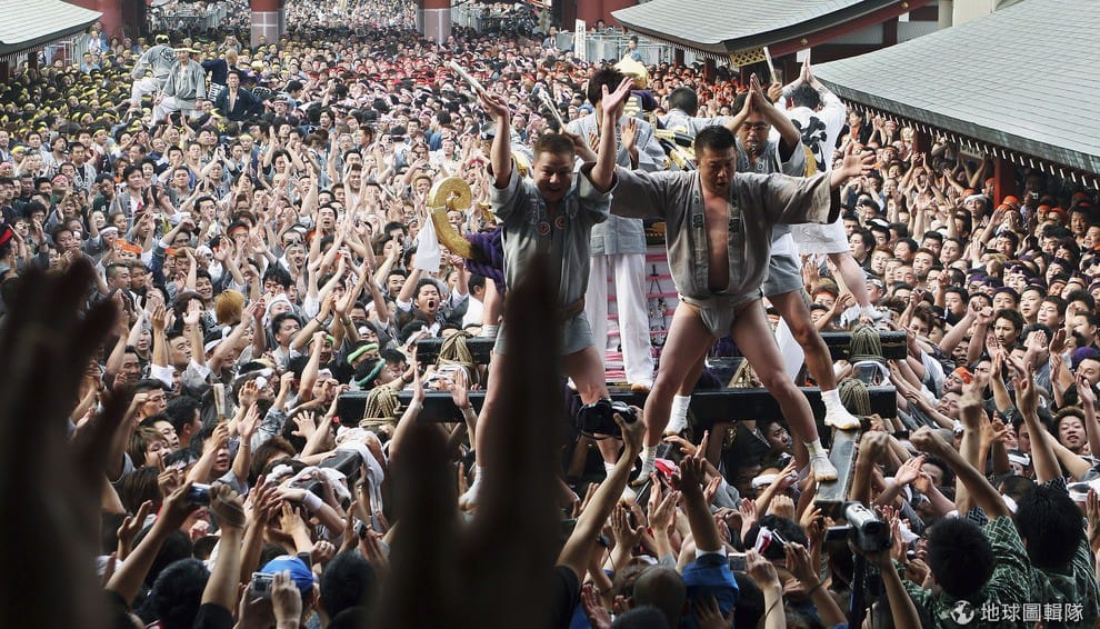 星期六的時候,100多座淺草地區的神轎在神社集合後,在路上遊行。這些神轎體型較小,幾十人就可以扛起。Keith Tsuji/Getty Images