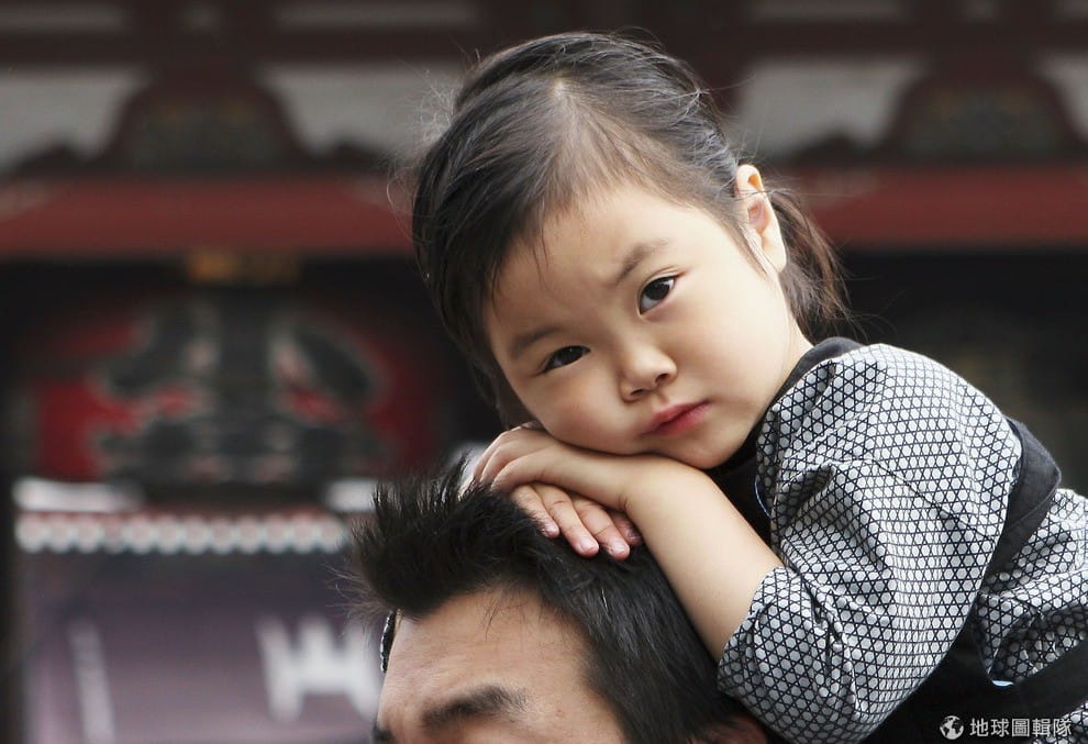 小女孩累了趴在爸爸身上。Koichi Kamoshida/Getty Images