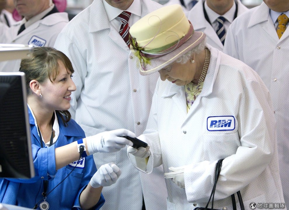 2010年,英國女王伊莉莎白來到黑莓公司參觀,手上拿著當時新一代的黑莓機。